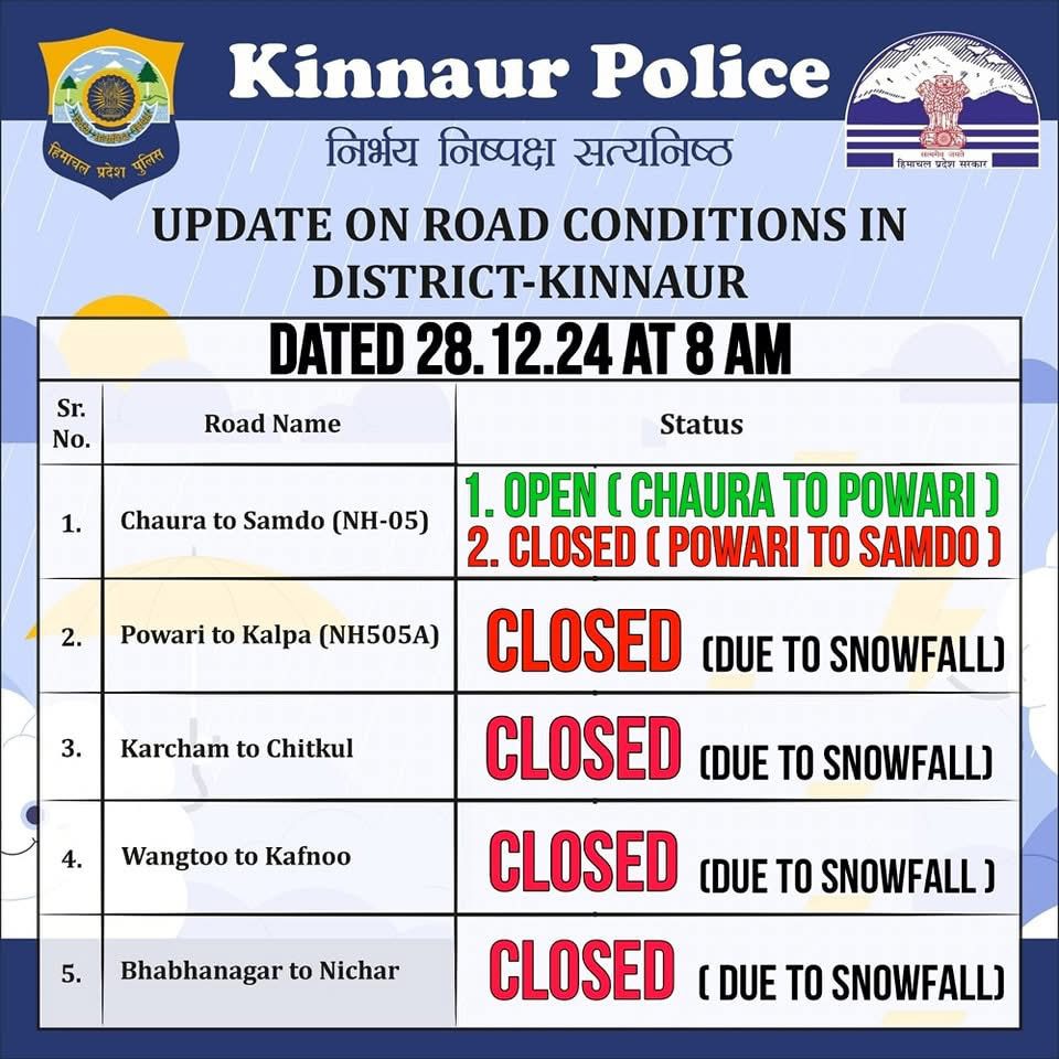 Road Status Update District KinnaurWeather Condition – &know the SnowingSnow Depth