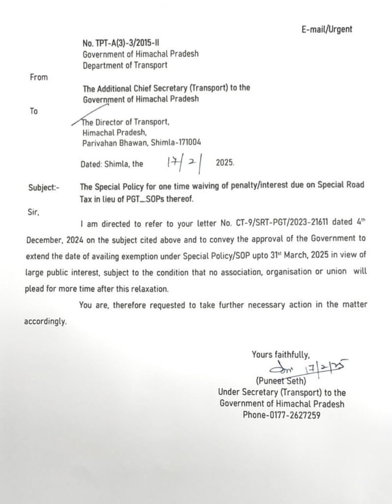 प्रदेश सरकार ने वाहनों पर लागू पुराना पैसेंजर गुड्स टैक्स की बकाया पैनल्टी एवं विशेष पथ कर जमा करने की अंतिम तिथि 31 मार्च 2025 तक बढ़ा दी है।