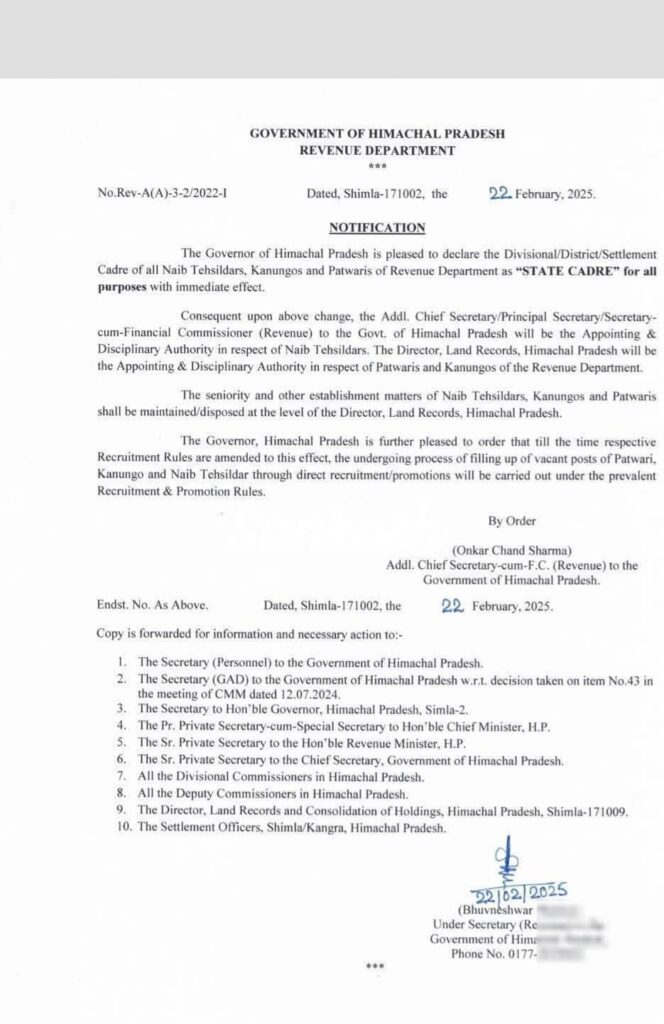 मुख्यमंत्री सुखविंदर सिंह सुक्खू ने पिछले साल यह घोषणा की थी कि पटवारी और कानून को स्टेट कैडर में लिए जाएंगे, यह प्रक्रिया चल रही थी।
