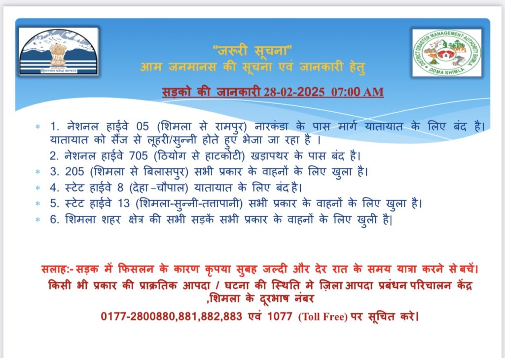 NH-05 from dhalli to fagu is open for vehicular traffic though there’s heavy rain fall in the region.