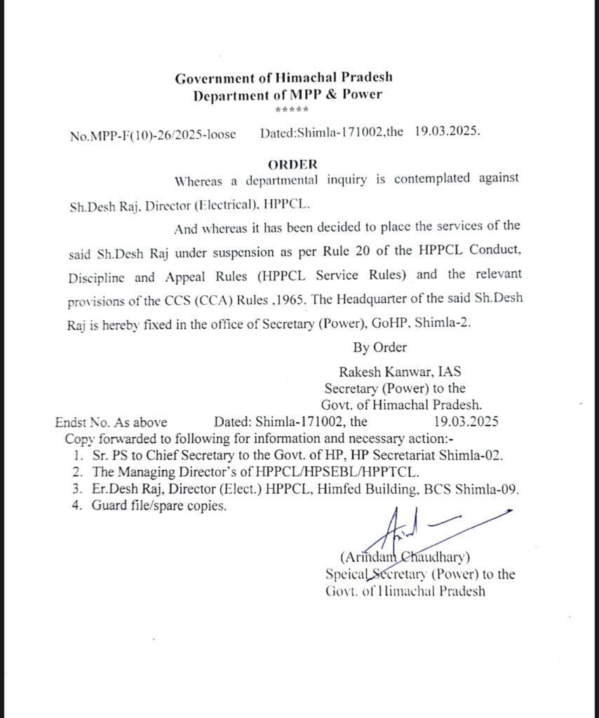 चूंकि देश राज, निदेशक (विद्युत), एचपीपीसीएल के विरुद्ध विभागीय जांच प्रस्तावित है। और चूंकि एचपीपीसीएल आचरण, अनुशासन एवं अपील नियम (एचपीपीसीएल सेवा नियम) के नियम 20 तथा सीसीएस (सीसीए) नियम, 1965 के सुसंगत प्रावधानों के अनुसार उक्त श्री देश राज की सेवाओं को निलंबित करने का निर्णय लिया है। उक्त देश राज का मुख्यालय सचिव (विद्युत), हिमाचल प्रदेश सरकार, शिमला-2 के कार्यालय में निर्धारित किया है।