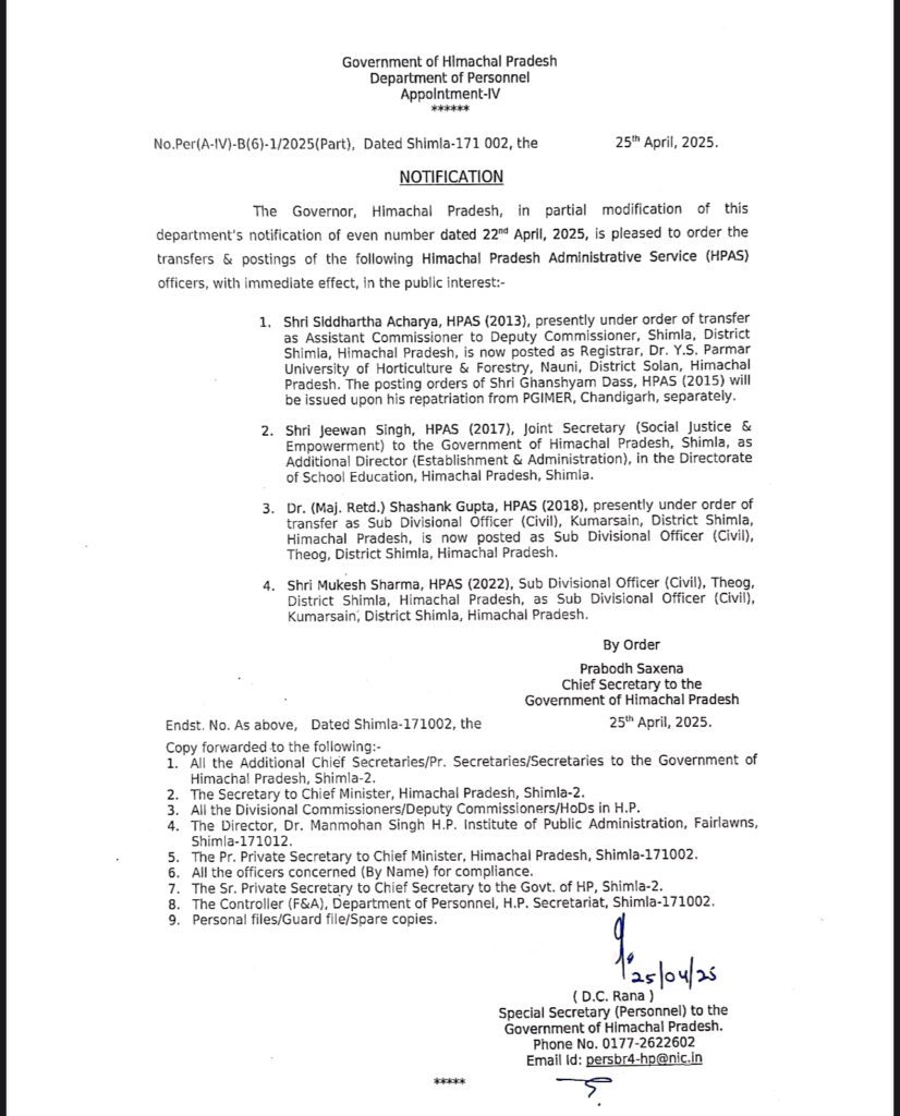 राज्य सरकार ने 4 HAS अधिकारियों के तबादला आदेश जारी किए । सीएस ने जारी किए आदेश ।किसे कहाँ मिली नई नियुक्ति जानने के लिए क्लिक करें
