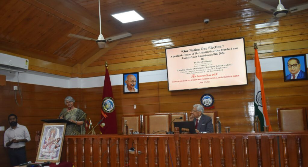 The welcome address was delivered by Prof. (Dr.) Priti Saxena, Hon’ble Vice Chancellor, HPNLU, who expressed her appreciation for Prof. Kumar’s valuable contributions to the constitutional scholarship and raised the various questions, such as federalism and democracy, in context of the 129thConstitutional Amendment Bill.