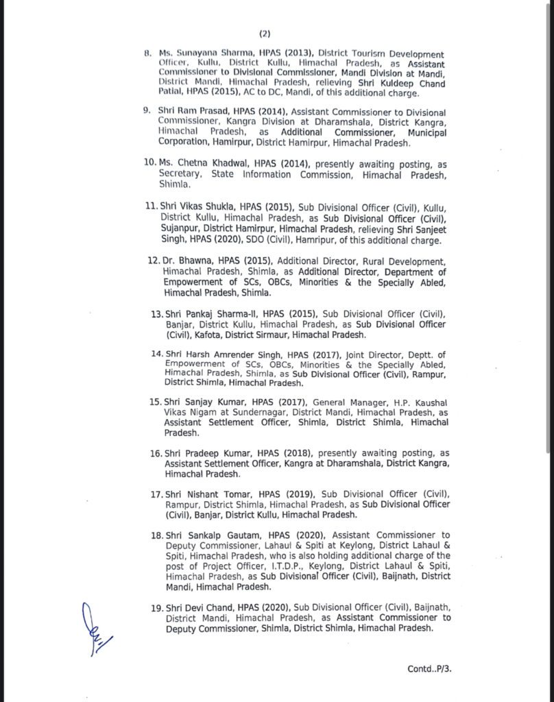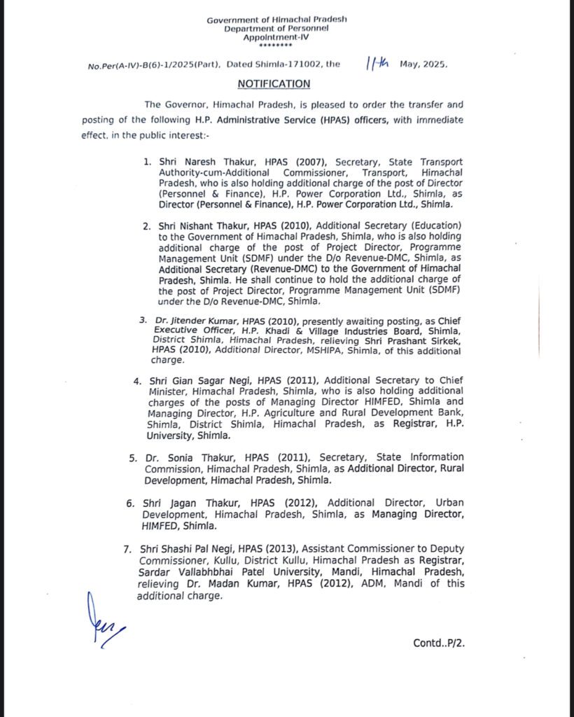 24 HPAS अधिकारियों के तबादले और नियुक्ति के आदेश जारी