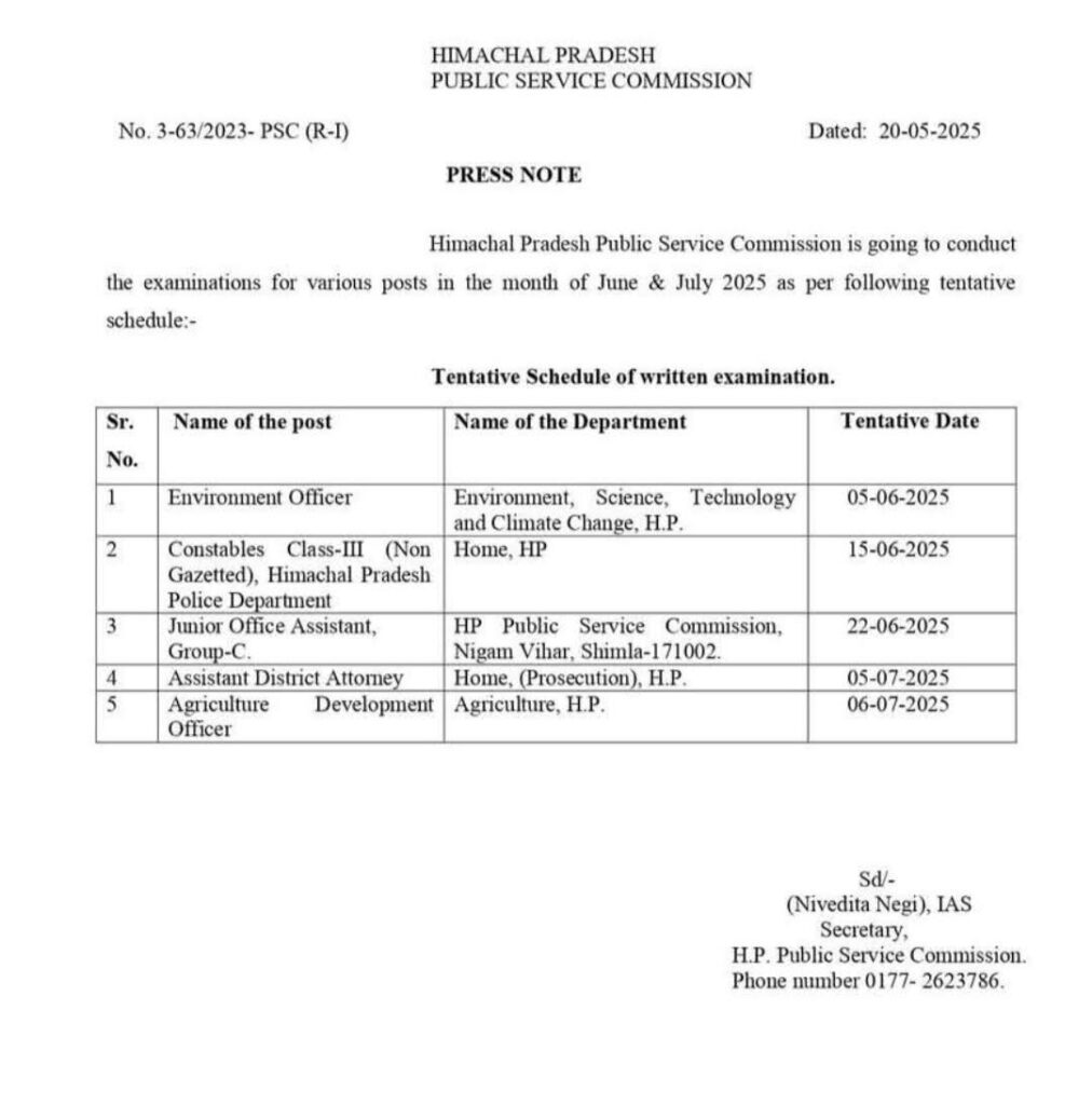 हिमाचल प्रदेश पुलिस कांस्टेबल भर्ती के लिए 15 जून को लिखित परीक्षा होगी। हिमाचल प्रदेश लोक सेवा आयोग ने लिखित परीक्षा का संभावित शेड्यूल जारी कर दिया है। ग्राउंड परीक्षा पास करने वाले 16,000 युवा लिखित परीक्षा देंगे।