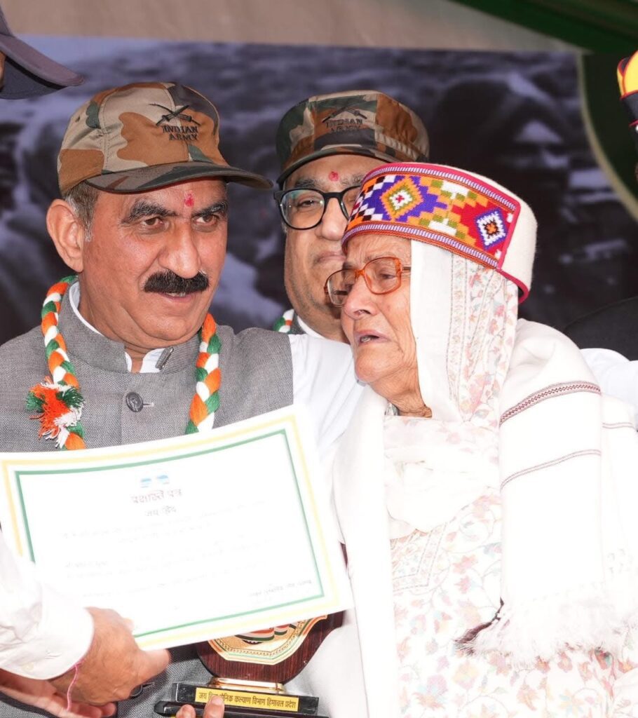 मुख्यमंत्री ने बिलासपुर ज़िला के कीर्ति चक्र विजेता शहीद सूबेदार संजीव कुमार की धर्मपत्नी सुजाता कुमारी, शिमला ज़िला के कीर्ति चक्र विजेता शहीद सिपाही पवन कुमार की धर्मपत्नी भजन और माता दासी, चम्बा ज़िला के कीर्ति चक्र विजेता शहीद सिपाही जगदीश चन्द के परिवार से स्नेह लता, सोलन ज़िला के कीर्ति चक्र विजेता राजिन्द्र सिंह की ओर से उनकी पत्नी सुनीता देवी, कांगड़ा ज़िला के वीर चक्र विजेता कर्नल संजीव सिंह की ओर से उनके पिता केहर सिंह, ऊना ज़िला के वीर चक्र विजेता शहीद कैप्टन अमोल कालिया के पिता सतपाल कालिया, बिलासपुर ज़िला के वीर चक्र विजेता कैप्टन रूप लाल, ऊना ज़िला के वीर चक्र विजेता हॉनरेरी कैप्टन सुखदेव ंिसह, कांगड़ा ज़िला के वीर चक्र विजेता हॉनरेरी कैप्टन भगवान सिंह राणा की धर्मपत्नी कमलेश राणा, हमीरपुर ज़िला के वीर चक्र विजेता शहीद हवलदार रमेश कुमार की धर्मपत्नी मीना कुमारी, बिलासपुर ज़िला के वीर चक्र विजेता हवलदार उधम सिंह, ऊना ज़िला के शहीद हवलदार कांसी राम की धर्मपत्नी रोशनी देवी, ऊना ज़िला के शौर्य चक्र एवं सेना मेडल विजेता कर्नल कंवर सरबजीत सिंह पंवर, ऊना ज़िला के शौर्य चक्र विजेता हॉनरेरी कैप्टन सुशील कुमार, कांगड़ा ज़िला के शौर्य चक्र विजेता शहीद हॉनरेरी कैप्टन पृथ्वी सिंह के पोते शीतल मनकोटिया, कांगड़ा ज़िला के शौर्य चक्र विजेता हॉनरेरी कैप्टन मदन लाल, कांगड़ा ज़िला के शौर्य चक्र विजेता शहीद हॉनरेरी कैप्टन माधो राम की धर्मपत्नी अजुधिया देवी, मण्डी ज़िला के शौर्य चक्र तथा सेना मेडल विजेता हॉनरेरी कैप्टन हलका राम, किन्नौर ज़िला के शौर्य चक्र विजेता हॉनरेरी कैप्टन पालडेन गयाचो, किन्नौर ज़िला के शौर्य चक्र विजेता हॉनरेरी कैप्टन भाग चैन, किन्नौर ज़िला के शौर्य चक्र विजेता हॉनरेरी कैप्टन महेन्द्र सिंह, लाहौल-स्पीति ज़िला के शौर्य चक्र विजेता हॉनरेरी कैप्टन नील चन्द, शिमला ज़िला के शौर्य चक्र विजेता शहीद सूबेदार वेद प्रकाश की ओर से शकुंतला देवी, कांगड़ा ज़िला के शौर्य चक्र विजेता शहीद सूबेदार ध्यान सिंह की धर्मपत्नी ललिता कुमारी, सोलन ज़िला के शौर्य चक्र विजेता शहीद नायब सूबेदार जगत राम, किन्नौर ज़िला के शौर्य चक्र विजेता शहीद नायब राज बहादुर की ओर से प्रेम भगती, हमीरपुर ज़िला के शौर्य चक्र विजेता शहीद हवलदार परशोतम ंिसह की धर्मपत्नी राजो देवी, हमीरपुर ज़िला के शौर्य चक्र विजेता नायक नरेन्द्र सिंह, सिरमौर ज़िला के शौर्य चक्र विजेता शहीद नायक राजेश कुमार की धर्मपत्नी राखी वर्मा, शिमला ज़िला के शौर्य चक्र विजेता शहीद रायफलमैन कुलभूषण मांटा की धर्मपत्नी नीटू कुमारी, हमीरपुर ज़िला के शौर्य चक्र विजेता शहीद सिपाही लखबीर सिंह की धर्मपत्नी लता देवी, क