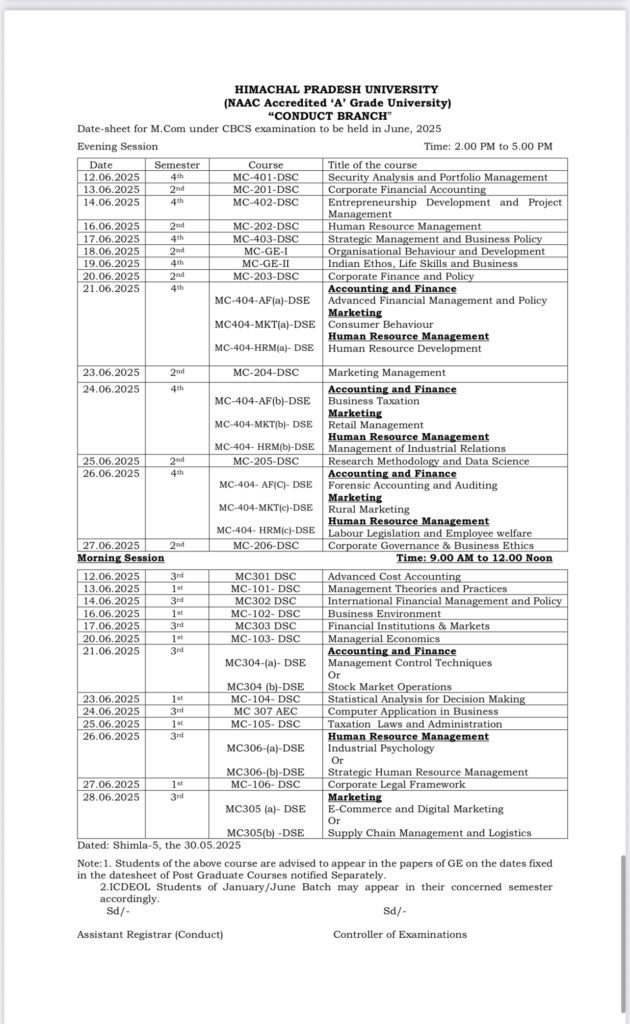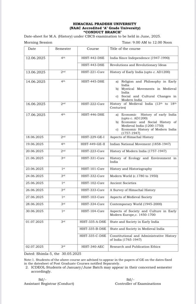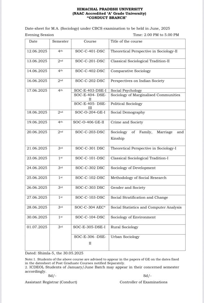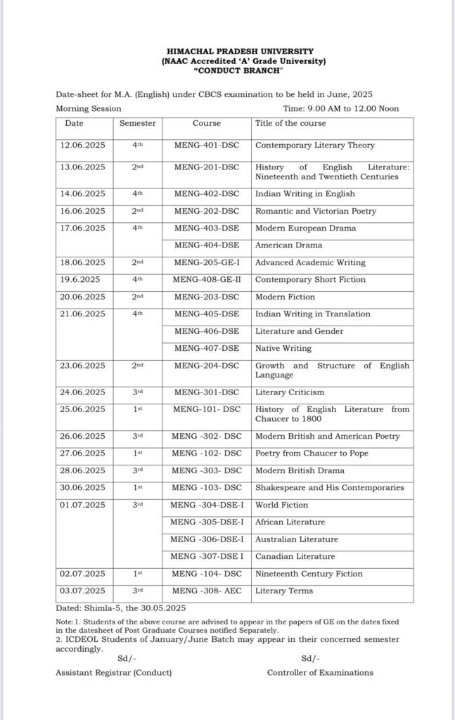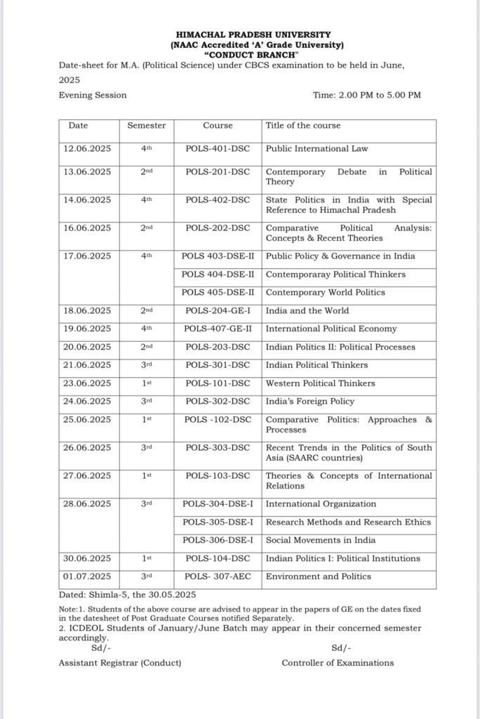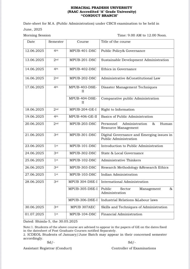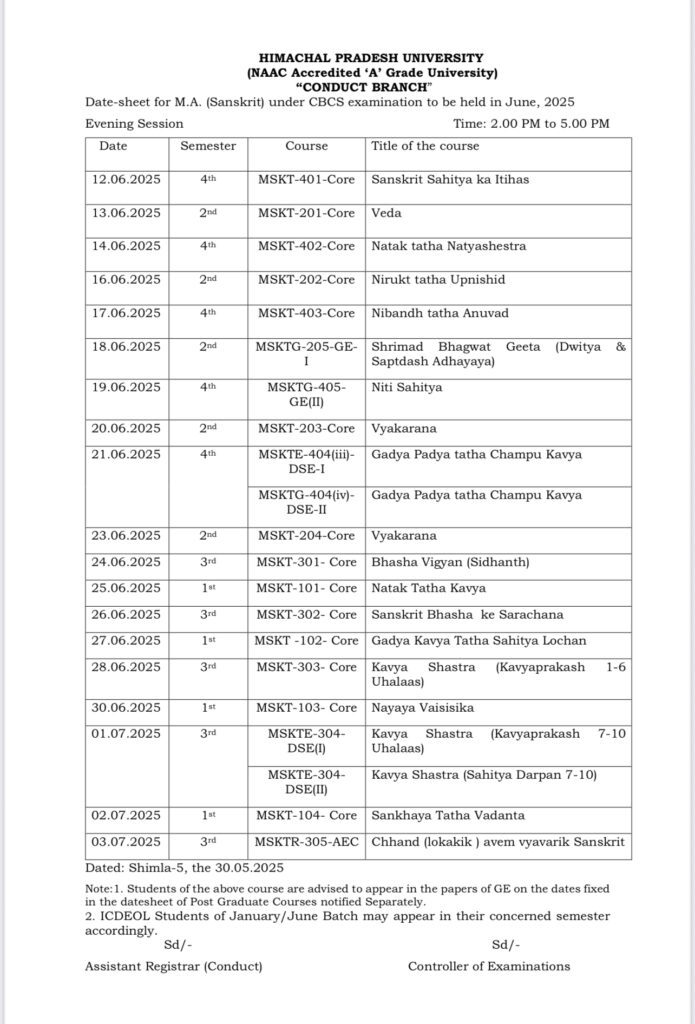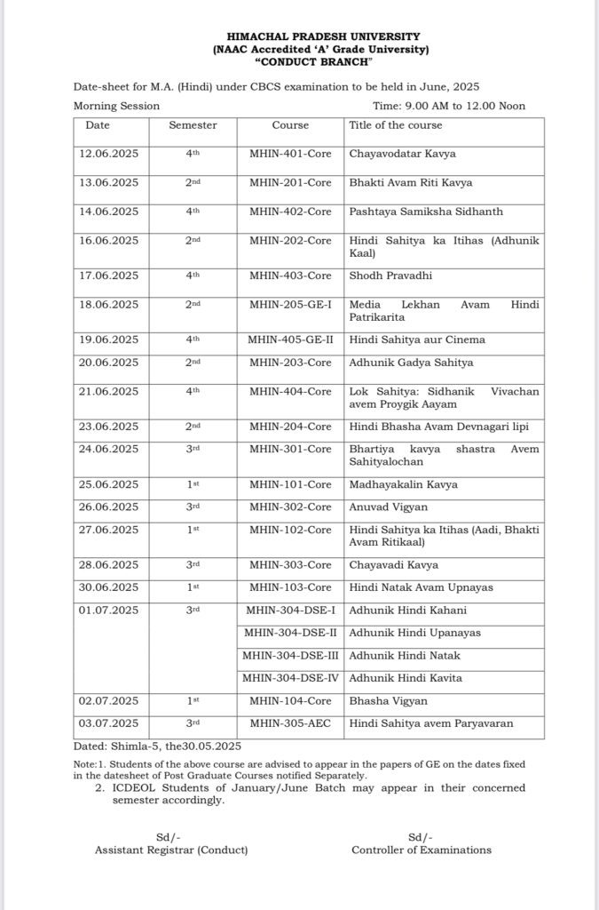 हिमाचल प्रदेश विश्वविद्यालय ने MA की परीक्षा शेड्यूल जारी कर दिया है ।इसमें सभी प्राचार्य/केंद्र अधीक्षक/उप अधीक्षक और छात्रों को निर्देश दिया है कि वे विश्वविद्यालय की वेबसाइट पर समय-समय पर अपलोड की गई तिथि-पत्रों में किसी भी परिवर्तन के लिए अपडेट रहें। जनवरी/जून बैच के आईसीडीईओएल छात्र अपने संबंधित सेमेस्टर में उपस्थित हो सकते हैं।