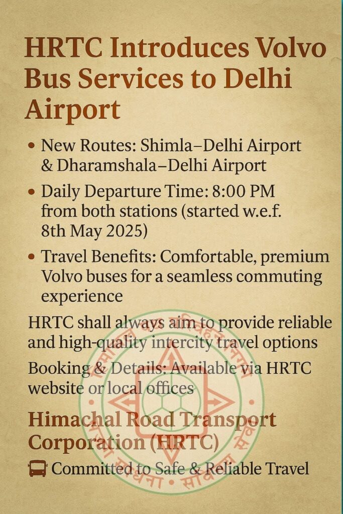 एचआरटीसी ने यात्रियों के लिए नई सुविधा शुरू की है ।अब शिमला और धर्मशाला से दिल्ली एयरपोर्ट के लिए रोज़ाना वोल्वो बस सेवा शुरू की है ।प्रस्थान समय: रात 8:00 बजे होगा ।एचआरटीसी के साथ अब आरामदायक और सुरक्षित सफर का भरोसा दिया गया है ।