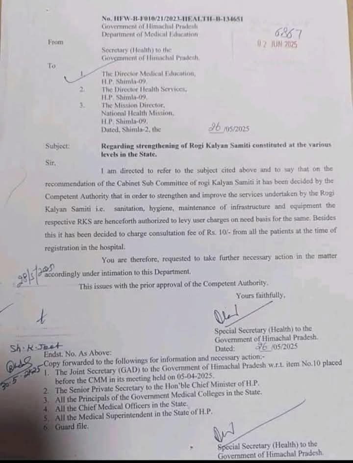 हिमाचल प्रदेश के सभी अस्पतालों में अब मरीजों के लिए 10 रुपए की पर्ची जरूरी कर दी गई है। सरकार ने रोगी कल्याण समिति RKS की ओर से दी जाने वाली सेवाओं स्वच्छता, स्वास्थ्य, बुनियादी ढांचे और उपकरणों के रखरखाव को सुदृढ़ करने के लिए यह फैसला लिया है। स्वास्थ्य सचिव ने इसे लेकर नोटिफिकेशन जारी कर दी है।अस्पतालों में यह शुल्क RKS द्वारा वसूला जाएगा। आदेशों में कहा गया कि कैबिनेट सब कमेटी की सिफारिश पर यह निर्णय लिया गया है। अब तक सभी सरकारी अस्पतालों में पर्ची मुफ्त में बनाई जाती थी। वर्तमान सरकार ने सालों पुरानी इस व्यवस्था को बदल दिया है।