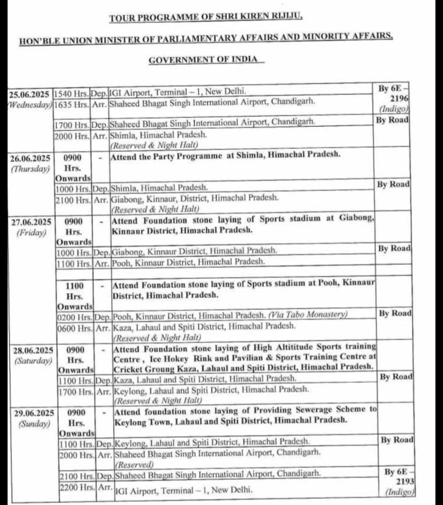माइनॉरिटी अफेयर्स मिनिस्टर किरण रिजू का हिमाचल के किन्नौर व लाहौल स्पीति के दौरे पर पहुंच रहे हैं ।
