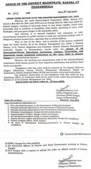 मुख्यमंत्री ठाकुर सुखविंदर सिंह सुक्खू ने राज्य के कुछ जिलों में भारी वर्षा की चेतावनी को देखते हुए संबंधित जिलों के उपायुक्तों को निर्देश दिए हैं कि वे भारत मौसम विज्ञान विभाग (IMD) द्वारा जारी रेड अलर्ट के दृष्टिगत अपने-अपने जिलों में सभी स्कूलों को बंद करने के आदेश तुरंत जारी करें। यह निर्णय विद्यार्थियों की सुरक्षा को प्राथमिकता देते हुए लिया गया है।