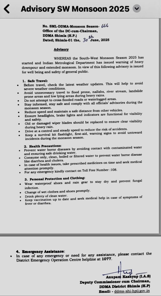 दक्षिण-पश्चिम मानसून सीजन 2025 शुरू हो चुका है और भारतीय मौसम विभाग ने भारी बारिश और मानसून के लंबे समय तक रहने की चेतावनी जारी की है। इसे देखते हुए आम जनता की भलाई और सुरक्षा सुनिश्चित करने के लिए आज यहां उपायुक्त एवं अध्यक्ष जिला आपदा प्रबंधन प्राधिकरण अनुपम कश्यप ने एडवाइजरी जारी की है।