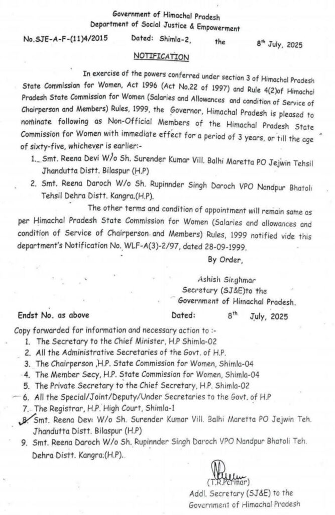 हिमाचल प्रदेश सरकार के सामाजिक न्याय एवं अधिकारिता विभाग ने हिमाचल प्रदेश राज्य महिला आयोग में दो गैर-सरकारी सदस्यों की नियुक्ति संबंधी अधिसूचना जारी की है। नियुक्त सदस्य बिलासपुर से रीना देवी और कांगड़ा से b रीना दरोच हैं। उनकी नियुक्ति तत्काल प्रभाव से प्रभावी होगी और तीन वर्ष या 65 वर्ष की आयु तक, जो भी पहले हो, कार्यरत रहेगी।