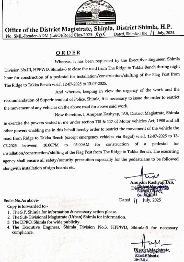 जिला दण्डाधिकारी शिमला अनुपम कश्यप ने आदेश जारी करते हुए बताया कि रिज से टका बेंच मार्ग पर यातायात (केवल रीगल की तरफ़ से आपातकालीन वाहनों को छोड़कर) 12 जुलाई से 13 जुलाई 2025 को रात 10 बजे से प्रातः 5 बजे तक बंद रहेगा ताकि रिज मैदान से टका बेंच तक राष्ट्रीय ध्वज को स्थानांतरित करने हेतु चौकी का निर्माण किया जा सके।