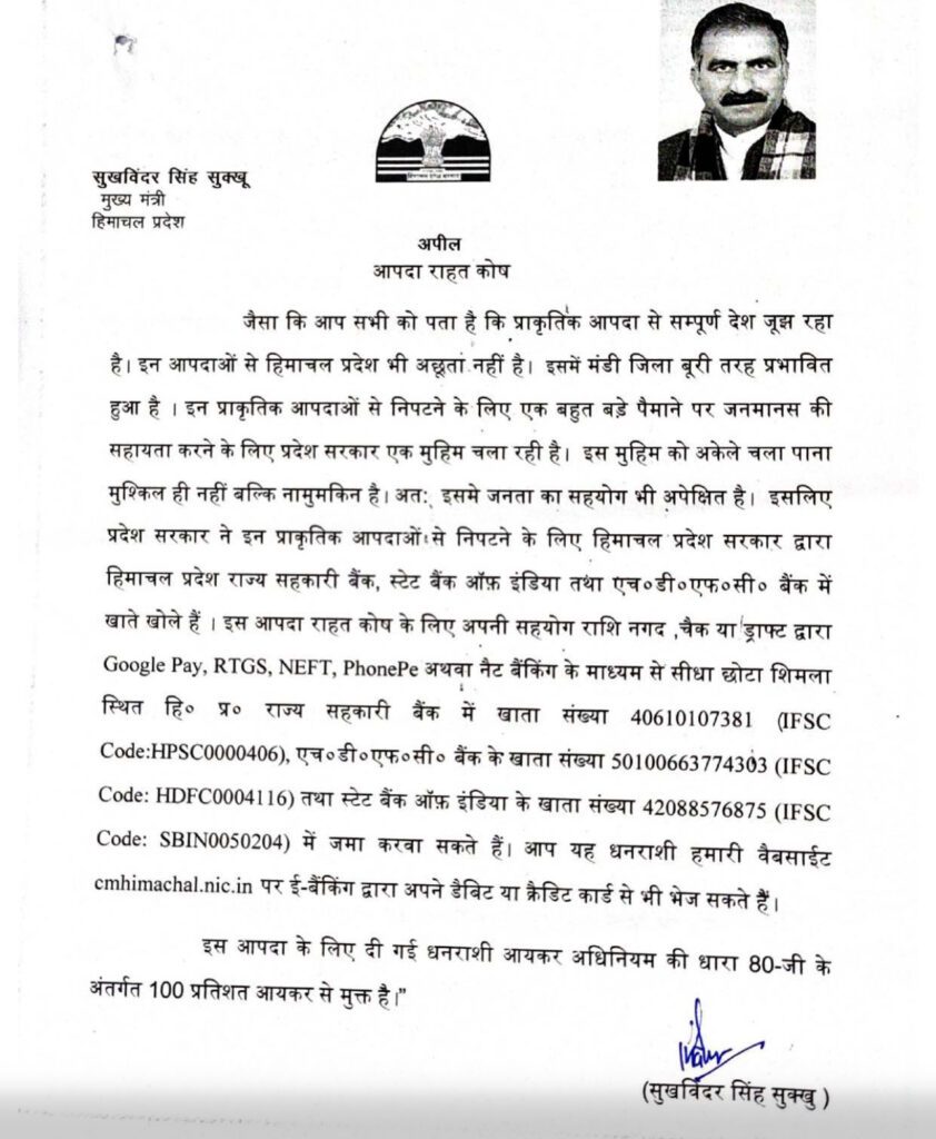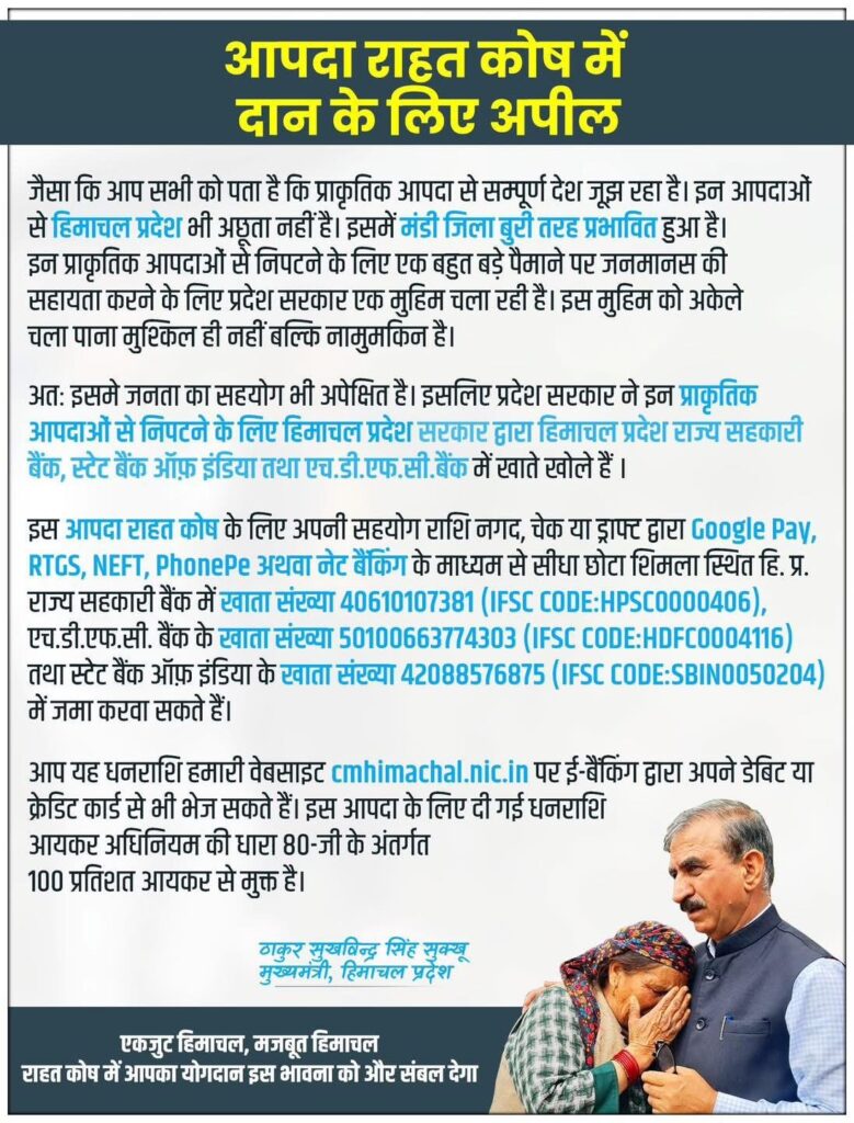 राशि का योगदान सीधा Google Pay, RTGS, PhonePe, NEFT अथवा नेट बैंकिंग के माध्यम से राज्य सहकारी बैंक, एचडीएफसी बैंक और स्टेट बैंक ऑफ इंडिया के विशेष खातों में किया जा सकता है। इसके अलावा, cmhimachal.nic.in पर जाकर भी ऑनलाइन सहायता दी जा सकती है।
