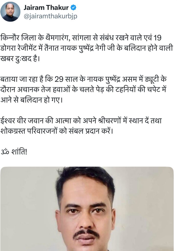 किन्नौर की सांगला तहसील के थैमगारंग पंचायत निवासी एवं 19 डोगरा रेज़ीमेंट में असम में तैनात वीर सपूत नायक पुष्पेंद्र नेगी के तेज़ हवाओं के चलते पेड़ की टहनियों की चपेट में आने से निधन हो गया।