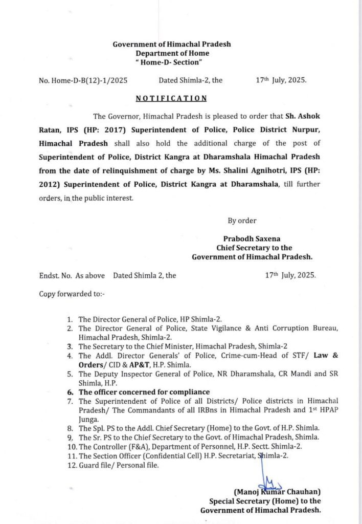 राज्य सरकार ने पुलिस विभाग में दो पुलिस अधिकारियों के तबादला आदेश जारी करते हुए अशोक रतन को सरकार ने अतिरिक्त कार्यभार सौंपा है ।अशोक रतन धर्मशाला में कांगड़ा जिले के पुलिस अधीक्षक का अतिरिक्त कार्यभार भी देखेंगे । यह बदलाव शालिनी अग्निहोत्री, आईपीएस (हिमाचल प्रदेश: 2012) द्वारा कार्यभार छोड़ने के बाद हुआ है, जो पहले धर्मशाला में कांगड़ा जिले की पुलिस अधीक्षक के पद पर कार्यरत थीं।