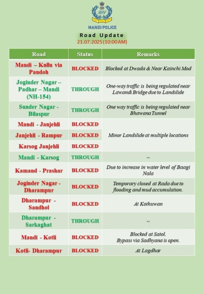 भारी बारिश और भूस्खलन के चलते मंडी ज़िले की अनेक प्रमुख सड़कों पर यातायात प्रभावित हुआ है। मंडी पुलिस ने ताज़ा रोड अपडेट जारी करते हुए कई मार्गों को अस्थायी रूप से बंद करने की जानकारी दी है, जबकि कुछ पर एकतरफा यातायात ही संभव है।