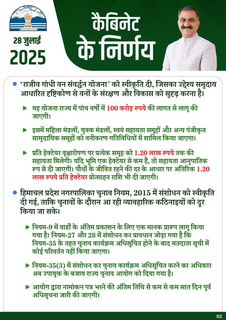 बैठक में ‘राजीव गांधी वन संवर्द्धन योजना’ को स्वीकृति दी, जिसका उद्देश्य समुदाय आधारित दृष्टिकोण से वनों के संरक्षण और विकास को सुदृढ़ करना है। यह योजना राज्य में पांच वर्षों में 100 करोड़ रुपये की लागत से लागू की जाएगी। इसमें महिला मंडलों, युवक मंडलों, स्वयं सहायता समूहों और अन्य पंजीकृत सामुदायिक समूहों को वनीकरण गतिविधियों में शामिल किया जाएगा। प्रति हेक्टेयर वृक्षारोपण पर प्रत्येक समूह को 1.20 लाख रुपये तक की सहायता मिलेगी। यदि भूमि एक हेक्टेयर से कम है, तो सहायता आनुपातिक रूप से दी जाएगी। पौधों के जीवित रहने की दर के आधार पर अतिरिक्त 1.20 लाख रुपये प्रति हेक्टेयर प्रोत्साहन राशि भी दी जाएगी।