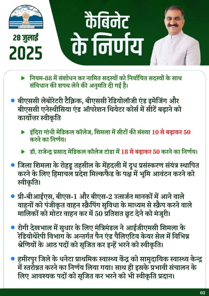 मंत्रिमंडल ने बीएससी लेबोरेटरी टैक्निक, बीएससी रेडियोलॉजी एंड इमेजिंग और बीएससी एनेस्थीसिया एंड ऑपरेशन थियेटर कोर्स मंे सीटें बढ़ाने को कार्याेत्तर स्वीकृति प्रदान की। इंदिरा गांधी मेडिकल कॉलेज, शिमला मेें सीटों की संख्या 10 से बढ़ाकर 50 और डॉ. राजेन्द्र प्रसाद मेडिकल कॉलेज टांडा में 18 से बढ़ाकर 50 करने का निर्णय लिया गया है।