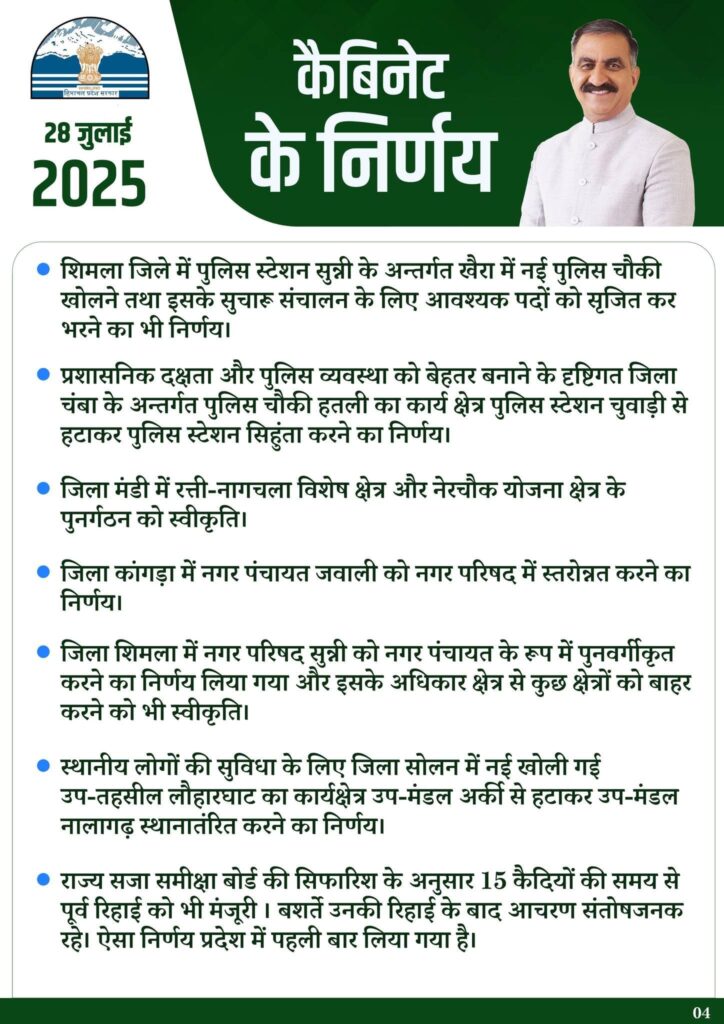 हिमाचल नगरपालिका चुनाव नियमों में बदलाव, अब मतदाता सूची चुनाव कार्यक्रम अधिसूचना के बाद नहीं बदलेगी।नगर पंचायत जवाली अब बनी नगर परिषद, सुन्नी का पुनर्गठन भी स्वीकृत।खैरा में खुलेगी नई पुलिस चौकी, चंबा की हतली चौकी का कार्यक्षेत्र भी बदला