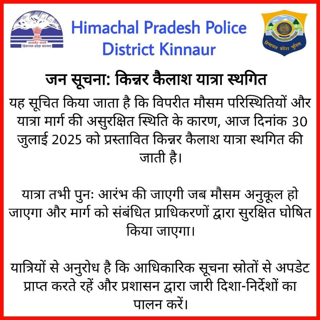 हिमाचल प्रदेश पुलिस, जिला किन्नौर द्वारा जारी एक सार्वजनिक सूचना के अनुसार, विपरीत मौसम परिस्थितियों और यात्रा मार्ग की असुरक्षित स्थिति को देखते हुए प्रस्तावित किन्नर कैलाश यात्रा को स्थगित कर दिया गया है। यह निर्णय यात्रियों की सुरक्षा को ध्यान में रखते हुए लिया गया है।