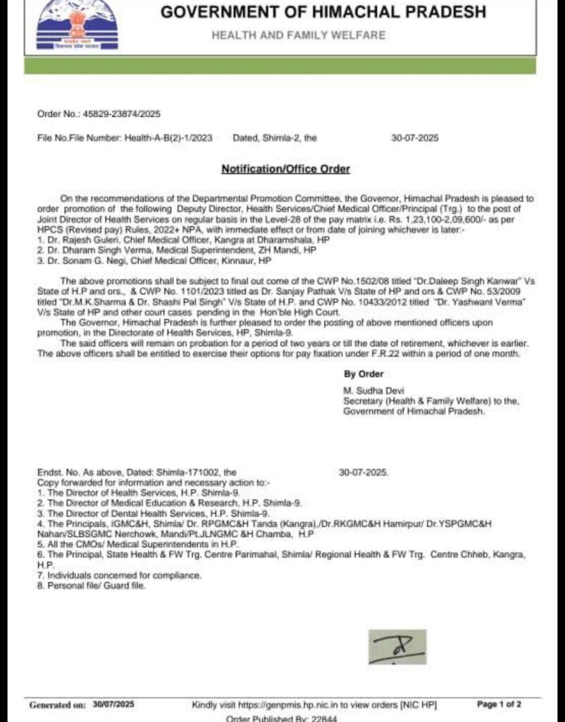 हिमाचल प्रदेश सरकार के स्वास्थ्य एवं परिवार कल्याण विभाग ने आज एक महत्वपूर्ण आदेश जारी करते हुए तीन वरिष्ठ चिकित्सकों को जॉइंट डायरेक्टर हेल्थ सर्विसेज के पद पर पदोन्नत किया है। यह पदोन्नतियाँ वेतन मैट्रिक्स लेवल-28 (₹2,09,600/- तक) के अनुसार की गई हैं।