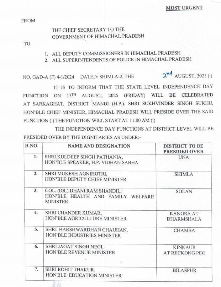 As per a notification from the Chief Secretary to the Government of Himachal Pradesh, the state-level Independence Day function will be held at Sarkaghat, District Mandi, on 15th August 2025 (Friday). Chief Minister Thakur Sukhvinder Singh Sukhu will preside over the event. The function is scheduled to start at 11:00 AM.