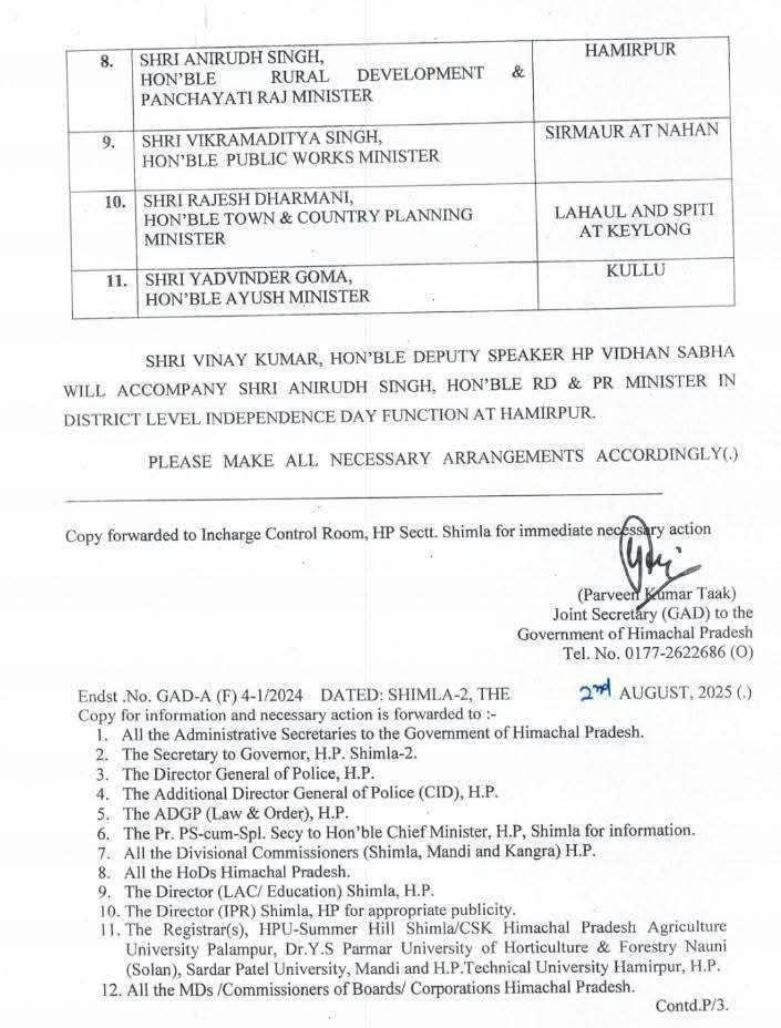 Deputy Speaker Shri Vinay Kumar will accompany Minister Anirudh Singh at Hamirpur for the Independence Day celebrations.