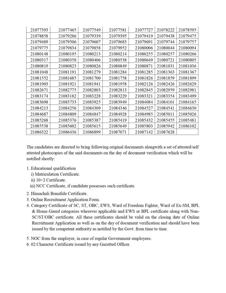 हिमाचल प्रदेश लोक सेवा आयोग द्वारा दिनांक 15.06.2025 को आयोजित ऑब्जेक्टिव टाइप स्क्रीनिंग टेस्ट के आधार पर, हिमाचल प्रदेश पुलिस विभाग में पुलिस कांस्टेबल (पुरुष) – विशेष ड्यूटी के 708 पदों की भर्ती के लिए उम्मीदवारों की अनंतिम रूप से चयन सूची जारी की गई है।
