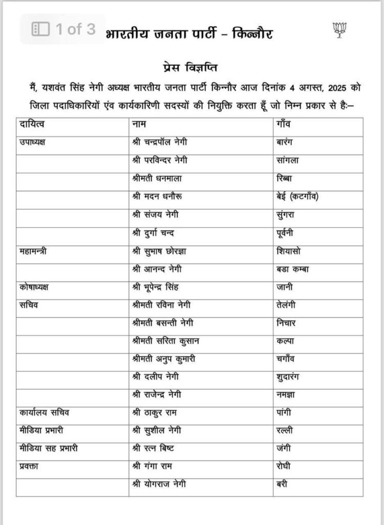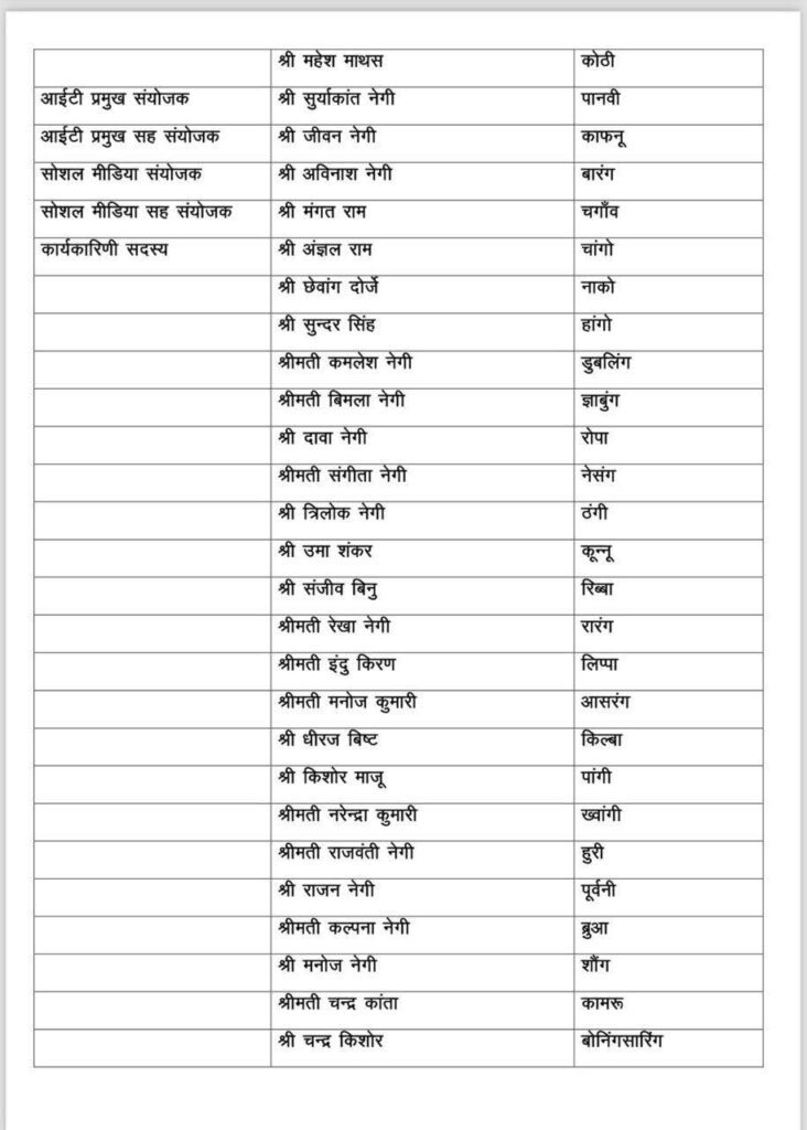 ने भारतीय जनता पार्टी जिला किन्नौर के सभी नवनियुक्त पदाधिकारियों एवं कार्यकारिणी सदस्यों को उनके नवीन दायित्व के लिए हार्दिक बधाई एवं शुभकामनाएं दी हैं। इस अवसर पर पार्टी के वरिष्ठ पदाधिकारियों और कार्यकर्ताओं ने आशा व्यक्त की कि सभी नवचयनित सदस्य भाजपा को जिला स्तर पर और अधिक सशक्त, संगठित और जनसंपर्क आधारित बनाएंगे।