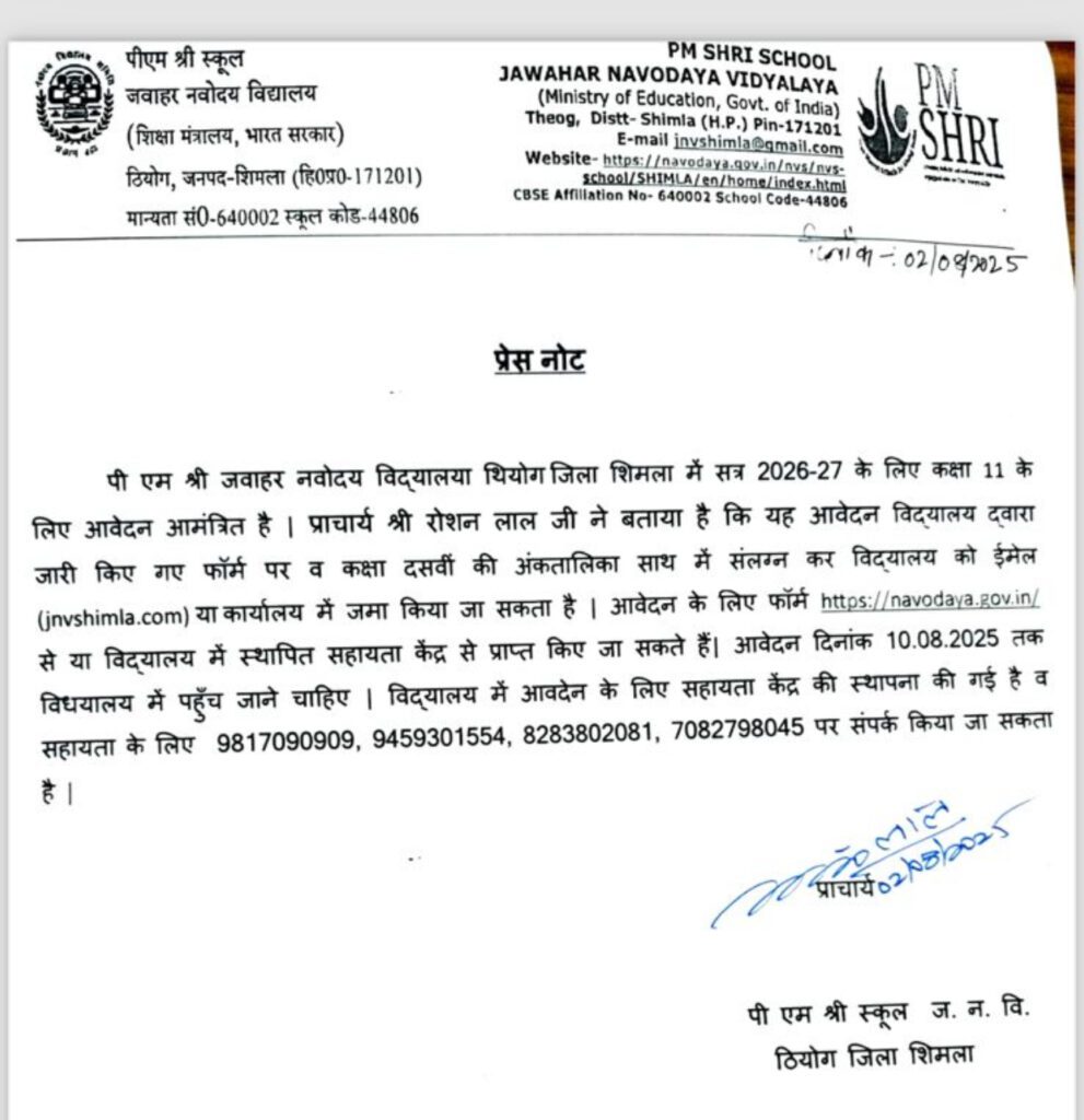 पीएम जवाहर नवोदय विद्यालय, ठियोग, जिला शिमला ने सत्र 2026-27 के लिए कक्षा 11वीं में प्रवेश हेतु आवेदन आमंत्रित किए हैं। विद्यालय के प्राचार्य श्री रोशन लाल जी ने जानकारी दी कि आवेदन विद्यालय द्वारा जारी किए गए फॉर्म पर किया जा सकता है, जिसे कक्षा दसवीं के अंकतालिका सहित ईमेल (jnvshimla@gmail.com) या विद्यालय कार्यालय में जमा किया जा सकता है।