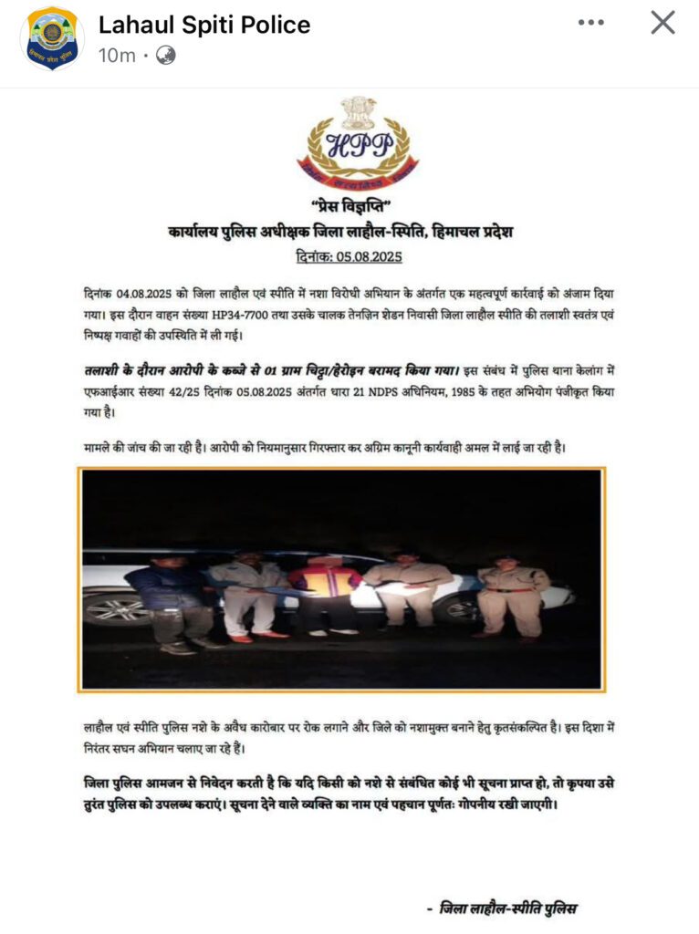 लाहौल एवं स्पीति पुलिस ने जिले में चलाए जा रहे नशा विरोधी अभियान के तहत एक बड़ी कार्रवाई को अंजाम दिया है। 4 अगस्त की रात को एक वाहन (HP34-7700) को तलाशी के लिए रोका गया, जिसमें चालक लंजिंग शेरपा निवासी लाहौल-स्पीति से 1 ग्राम चिट्टा/हेरोइन बरामद की गई।