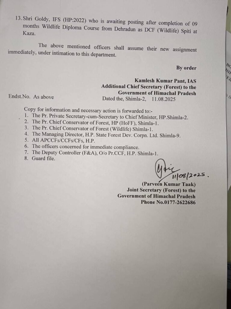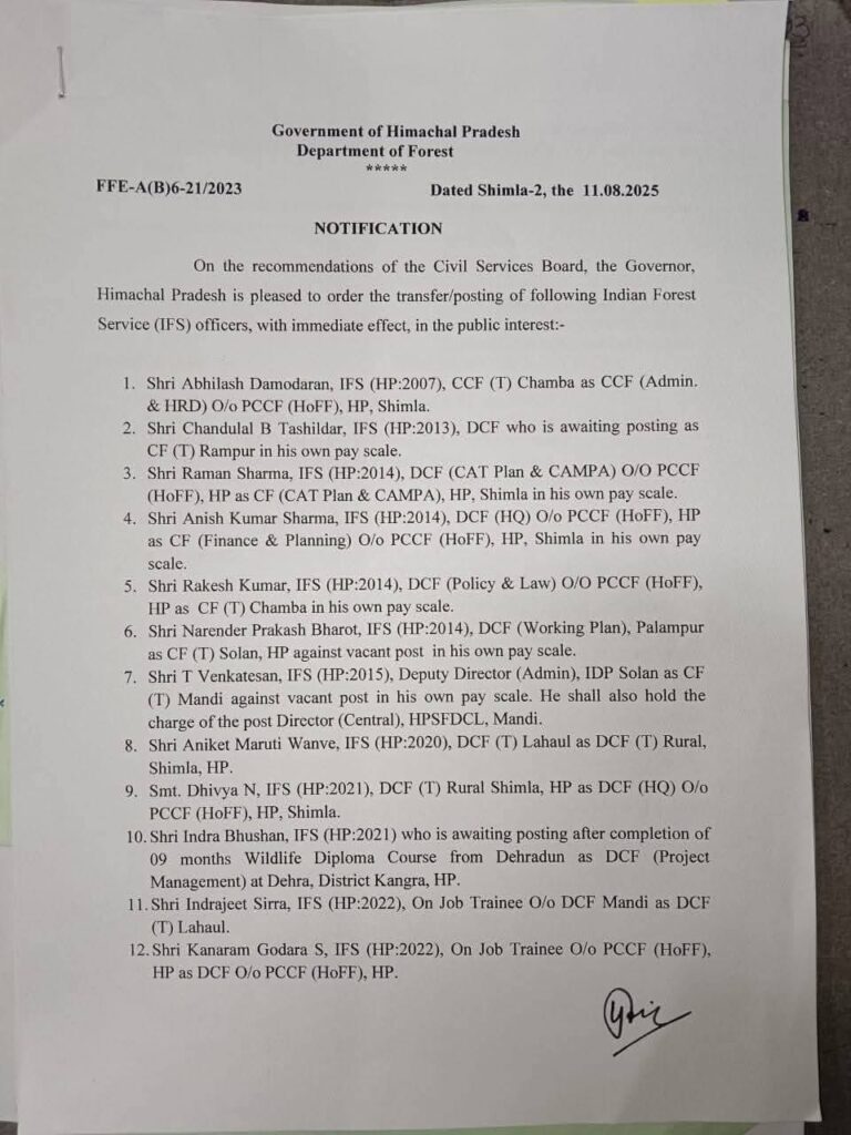 कई जिलों में नए अधिकारी संभालेंगे जिम्मेदारी, लाहौल,चंबा, किन्नौर समेत कई क्षेत्रों में नए DCF/CCF नियुक्त