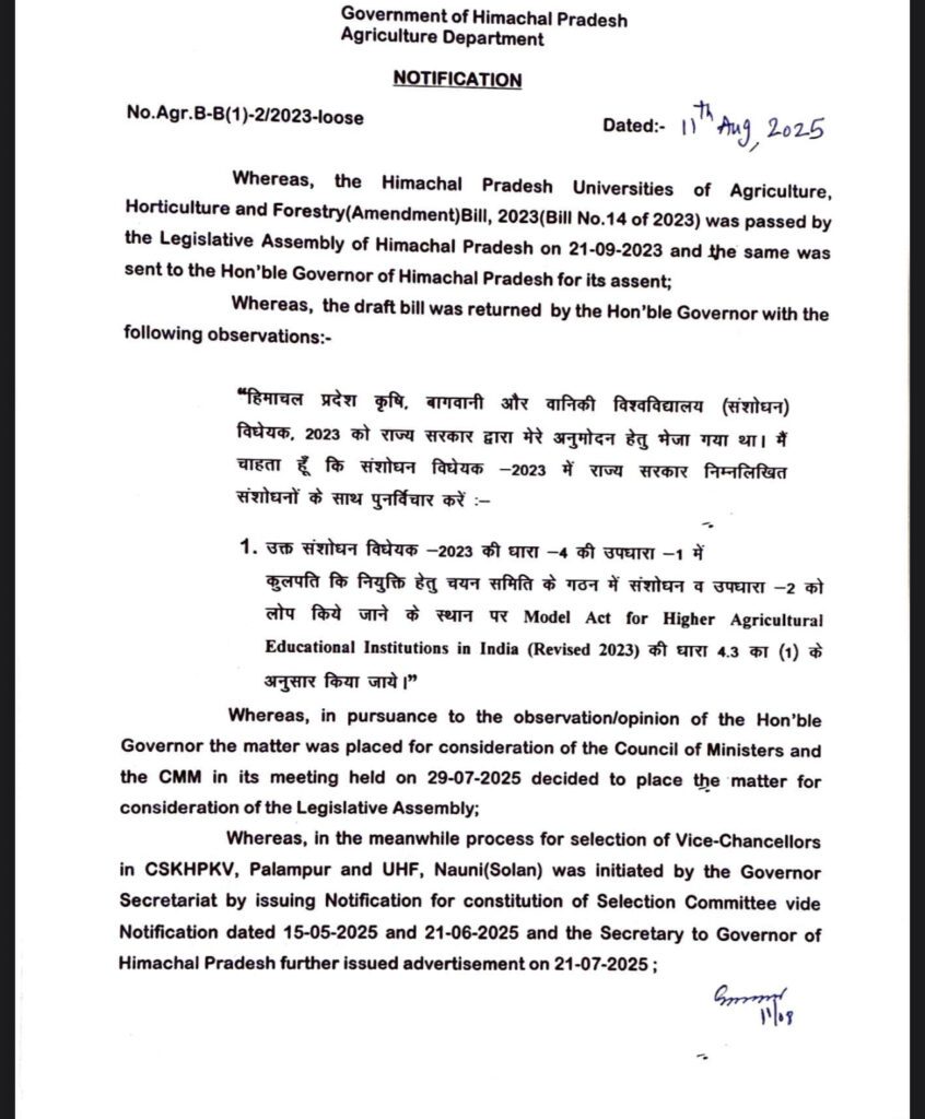 हिमाचल प्रदेश कृषि, बागवानी और वानिकी विश्वविद्यालय (संशोधन) विधेयक, 2023 को लेकर राज्य सरकार और राज्यपाल सचिवालय के बीच मतभेद गहरा गया है।