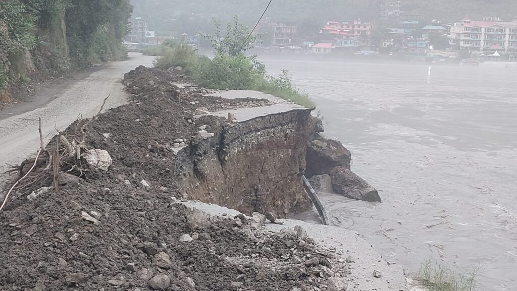 शनिवार रात शिमला–मंडी राष्ट्रीय राजमार्ग पर तत्तापानी के पास बड़ा भू–क्षरण हुआ है । सतलुज नदी के लगातार कटाव (scouring) के चलते सड़क का हिस्सा धंस गया और अब केवल 4.20 मीटर चौड़ाई का मार्ग ही बचा है।