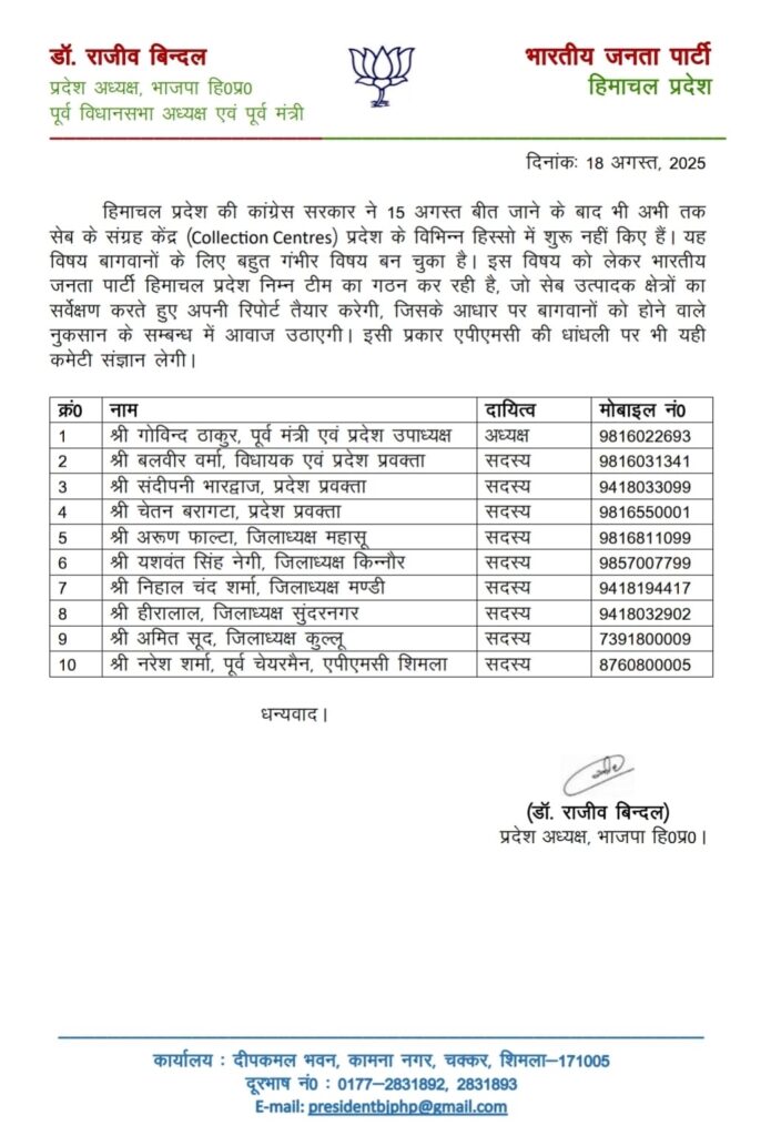 भाजपा प्रदेश अध्यक्ष डॉ राजीव बिंदल ने एक अधिसूचना जारी करते हुए कहा कि हिमाचल प्रदेश की कांग्रेस सरकार ने 15 अगस्त बीत जाने के बाद भी अभी तक सेब के संग्रह केंद्र (Collection Centres) प्रदेश के विभिन्न हिस्सो में शुरू नहीं किए हैं। यह विषय बागवानों के लिए बहुत गंभीर विषय बन चुका है। इस विषय को लेकर भारतीय जनता पार्टी हिमाचल प्रदेश निम्न टीम का गठन कर रही है, जो सेब उत्पादक क्षेत्रों का सर्वेक्षण करते हुए अपनी रिपोर्ट तैयार करेगी, जिसके आधार पर बागवानों को होने वाले नुकसान के सम्बन्ध में आवाज उठाएगी। इसी प्रकार एपीएमसी की धांधली पर भी यही कमेटी संज्ञान लेगी।
