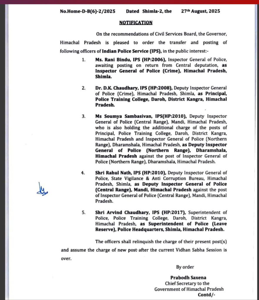 शिमला, 27 अगस्त 2025 – हिमाचल प्रदेश सरकार ने सिविल सेवा बोर्ड की सिफारिश पर राज्यपाल की मंजूरी के बाद भारतीय पुलिस सेवा (IPS) के कई अधिकारियों के तबादले और तैनाती के आदेश जारी किए हैं।