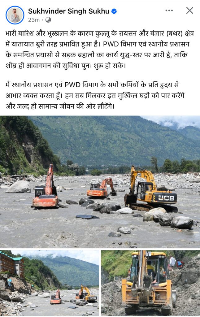 –हिमाचल प्रदेश के मुख्यमंत्री ठाकुर सुखविन्द्र सिंह सुक्खू ने कहा कि भारी बारिश और भूस्खलन के चलते कुल्लू जिले के रायसन और बंजार (बथर) क्षेत्र में यातायात व्यवस्था बुरी तरह बाधित हुई है। उन्होंने बताया कि PWD विभाग और स्थानीय प्रशासन के संयुक्त प्रयासों से सड़क बहाली का कार्य युद्ध-स्तर पर जारी है, ताकि जल्द ही आवागमन बहाल किया जा सके।