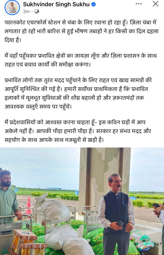 हिमाचल प्रदेश के मुख्यमंत्री सुखविंदर सिंह सुक्खू आज पठानकोट एयरफोर्स स्टेशन से चंबा के लिए रवाना हो गए हैं। ज़िला चंबा में लगातार हो रही भारी बारिश और भूस्खलन से भारी तबाही हुई है, जिससे लोगों का जनजीवन बुरी तरह प्रभावित हुआ है।