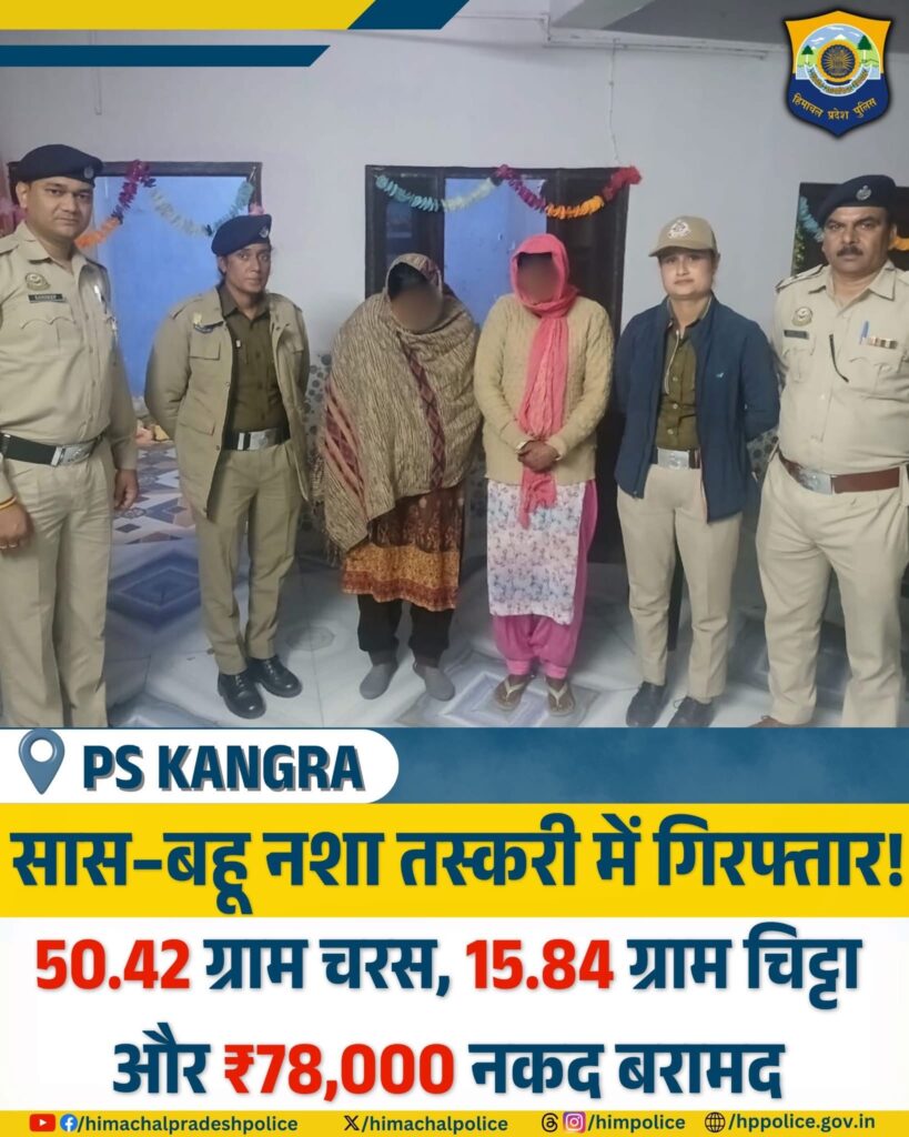 IBEX NEWS,शिमला/कांगड़ा, 29 अक्तूबर — सास बहू के बीच की खटपट को लेकर दुनियाभर में रिश्ता यूँ ही बदनाम है ।हिमाचल प्रदेश में तो सास और बहू की कुंडली मजे से जम रही थी । दोनों अपने धंधे में मोटी रकम कमा रही थी । सास और बहू नशे बेचने के कारोबार का घिनौना खेल खेल रही थी और दोनों को पुलिस ने नशा तस्करी के धंधे में दबोचा है,कांगड़ा पुलिस ने नशे के खिलाफ चलाए जा रहे अभियान के तहत एक बड़ी सफलता हासिल की है। पुलिस ने सास और बहू को नशा तस्करी के आरोप में गिरफ्तार किया है। आरोपियों के कब्जे से 50.42 ग्राम चरस, 15.84 ग्राम चिट्टा तथा ₹78,000 नकद बरामद किए गए हैं।