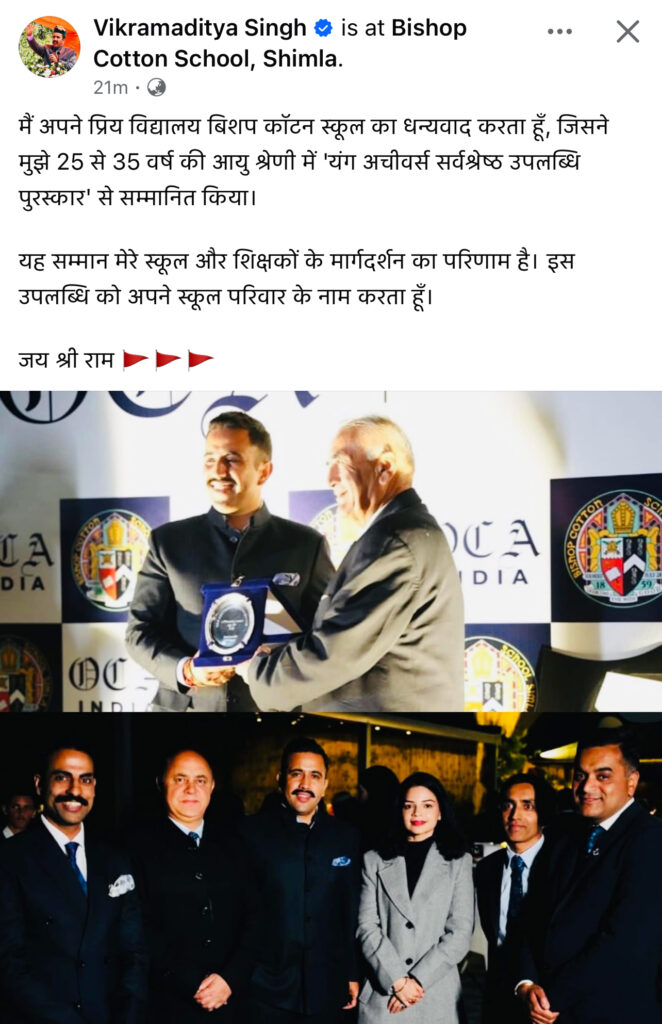 बिशप कॉटन स्कूल के पूर्व छात्र और हिमाचल प्रदेश के लोक निर्माण मंत्री विक्रमादित्य सिंह को 25 से 35 वर्ष आयु वर्ग में ‘यंग अचीवर्स सर्वश्रेष्ठ उपलब्धि पुरस्कार’ से सम्मानित किया गया। स्कूल द्वारा आयोजित इस विशेष समारोह में उन्हें उत्कृष्ट नेतृत्व, सामाजिक योगदान और जनसेवा के प्रति समर्पण के लिए यह सम्मान प्रदान किया गया।