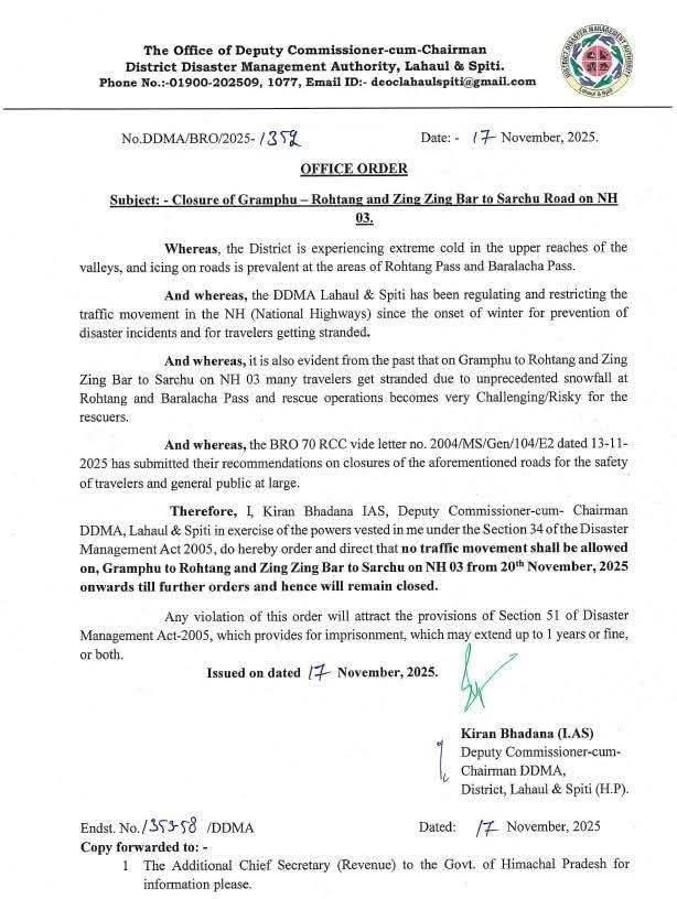 लाहौल–स्पीति प्रशासन ने ऊपरी क्षेत्रों में लगातार बढ़ रही ठंड, सड़कों पर जमा बर्फ और आगामी भारी बर्फबारी की आशंका को देखते हुए राष्ट्रीय राजमार्ग-03 पर दो महत्वपूर्ण मार्गों—ग्राम्फू से रोहतांग पास और जिंग-जिंग बार से सर्चू—को 20 नवंबर 2025 से अगले आदेशों तक बंद करने के आदेश जारी किए हैं। उपायुक्त एवं जिला आपदा प्रबंधन प्राधिकरण (DDMA) के अध्यक्ष किरण भड़ाना (IAS) द्वारा जारी आदेश में कहा गया है कि रोहतांग व बारालाचा दर्रों के क्षेत्र में अत्यधिक शीत लहर और बर्फ जमने के कारण सफर करना जोखिमपूर्ण हो गया है। प्रशासन के अनुसार, पिछली सर्दियों में हुईं घटनाओं से यह स्पष्ट है कि अचानक बर्फबारी के चलते कई यात्री इन दर्रों में फंस जाते हैं, जिनका बचाव कार्य अत्यंत चुनौतीपूर्ण और खतरनाक साबित होता है।