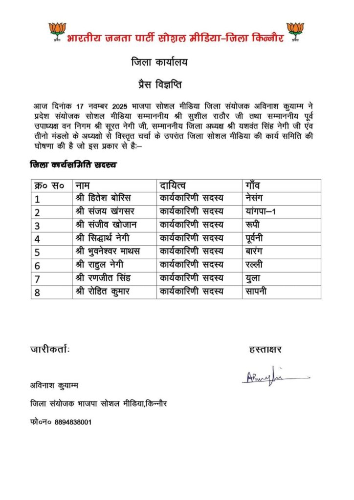 भारतीय जनता पार्टी सोशल मीडिया जिला किन्नौर की नई कार्यकारिणी समिति का गठन आज औपचारिक रूप से घोषित कर दिया गया। इस घोषणा को भाजपा सोशल मीडिया जिला संयोजक अविनाश कुजुम ने प्रदेश संयोजक सोशल मीडिया संदीप चालेरे, प्रदेश मीडिया सह-संयोजक सुशील राठौर, पूर्व जिला उपाध्यक्ष सर नेगी, जिला अध्यक्ष रघुवीर सिंह नेगी, तथा तीनों मंडलों के अध्यक्षों के साथ विस्तृत चर्चा के उपरांत जारी किया।