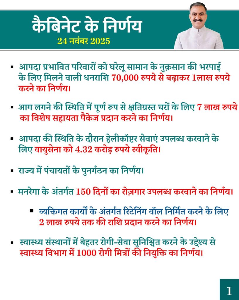 मुख्यमंत्री ठाकुर सुखविंद्र सिंह सुक्खू की अध्यक्षता में आज यहां आयोजित राज्य मंत्रिमंडल की बैठक में आपदा प्रभावित परिवारों को घरेलू सामान के नुकसान की भरपाई के लिए मिलने वाली धनराशि 70,000 रुपये से बढ़ाकर एक लाख रुपये करने का निर्णय लिया गया।पंचायतों के पुनर्गठन और पुनर्सीमांकन की प्रक्रिया व पुलिस विभाग में 800 कॉन्स्टेबल पदों को भरने का निर्णय भी लिया।ऐसे में पंचायत चुनाव आगे सरक सकते हैं। बैठक में 64 विभिन्न एजेंडों पर चर्चा हुई।