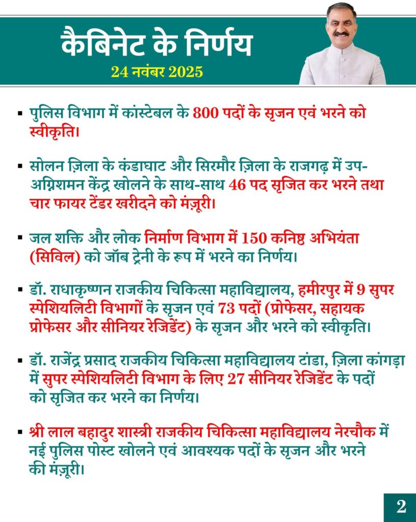 बैठक में डॉ. राधाकृष्णन राजकीय चिकित्सा महाविद्यालय, हमीरपुर में नौ सुपर स्पेशियलिटी विभागों के सृजन एवं 73 पदों (प्रोफेसर, सहायक प्रोफेसर और सीनियर रेजिडेंट) के सृजन और भरने को स्वीकृति दी गई।