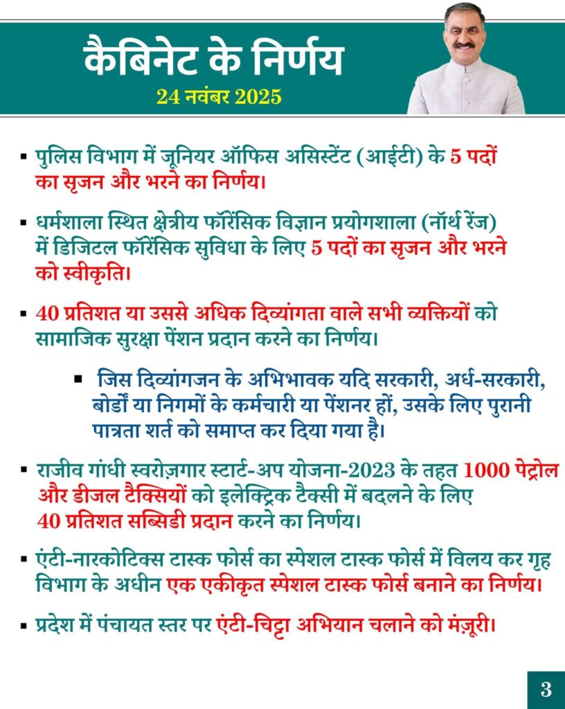 मंत्रिमंडल ने एंटी-नारकोटिक्स टास्क फोर्स का स्पेशल टास्क फोर्स में विलय कर गृह विभाग के अधीन एक एकीकृत स्पेशल टास्क फोर्स बनाने का निर्णय लिया है। इसका उद्देश्य संचालन क्षमता में सुधार और नशे से जुड़े मामलों से निपटने के लिए एक प्रभावी एजेंसी तैयार करना है। इसके साथ ही प्रदेश में पंचायत स्तर पर एंटी-चिट्टा अभियान चलाने को भी मंजूरी प्रदान की गई।