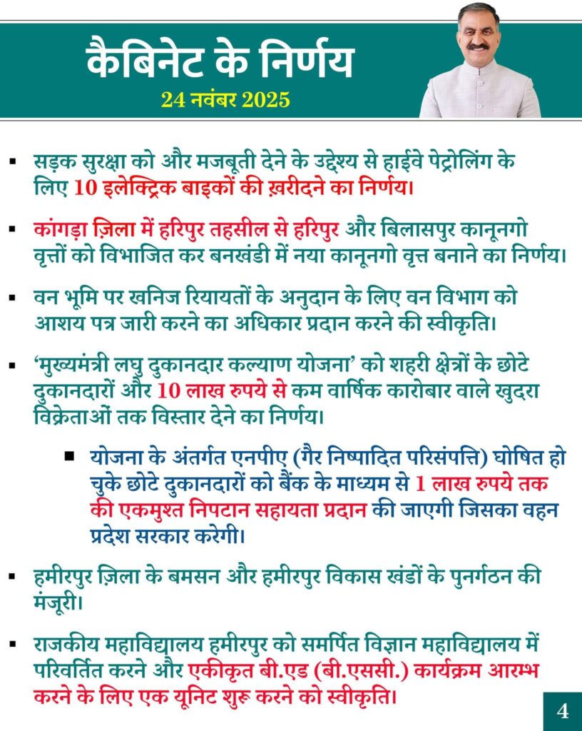 घरेलू नुकसान की भरपाई अब एक लाख, आग से क्षतिग्रस्त घरों को 7 लाख का पैकेज; मनरेगा में 150 दिन रोजगार, स्वास्थ्य-पुलिस-शिक्षा में बड़े पैमाने पर पद सृजन; दिव्यांगजनों को बिना शर्त सामाजिक सुरक्षा पेंशन, 1000 टैक्सियाँ बनेंगी इलेक्ट्रिक; पंचायतों का पुनर्गठन और एंटी-चिट्टा अभियान को भी हरी झंडी।