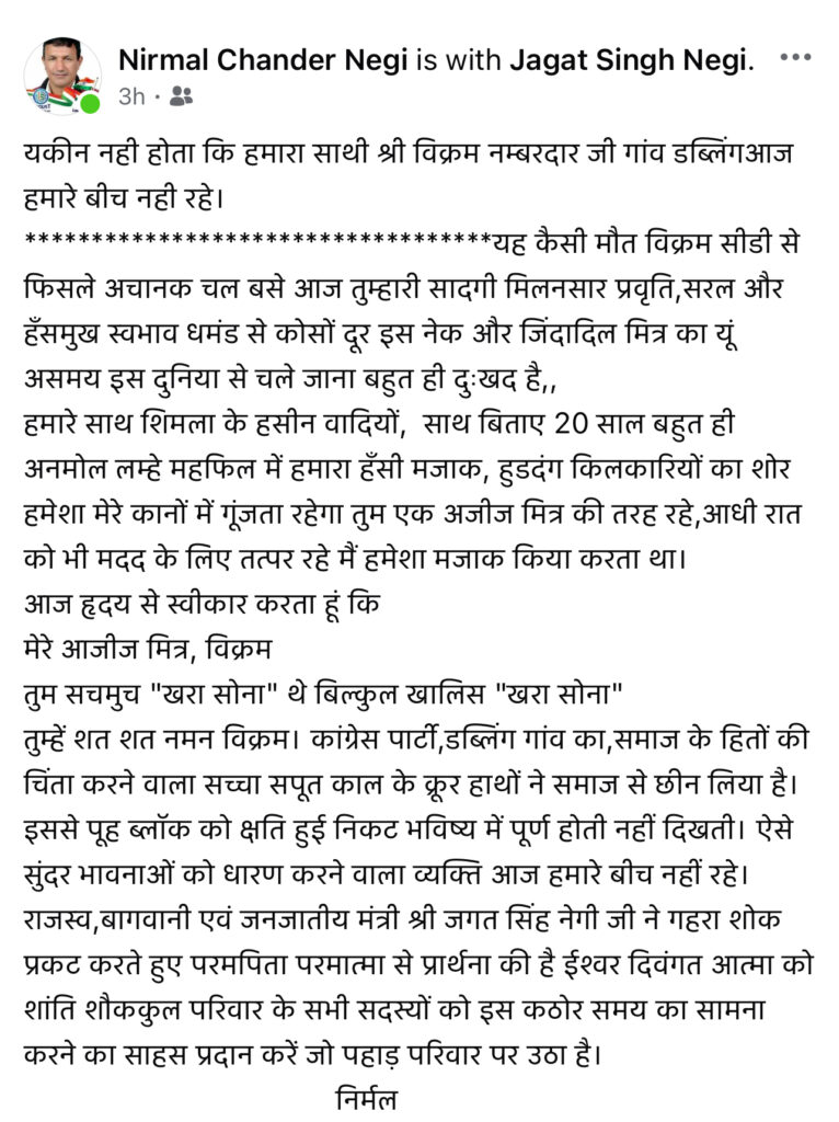 “विक्रम एक सच्चे, सरल, समाजसेवी और खरे इंसान थे। उनका जाना डब्लिंग गांव, पूह ब्लॉक और पूरी कांग्रेस परिवार के लिए अपूरणीय क्षति है। ईश्वर दिवंगत आत्मा को शांति दे और शोकग्रस्त परिवार को यह कठोर समय सहन करने का सामर्थ्य प्रदान करे।”