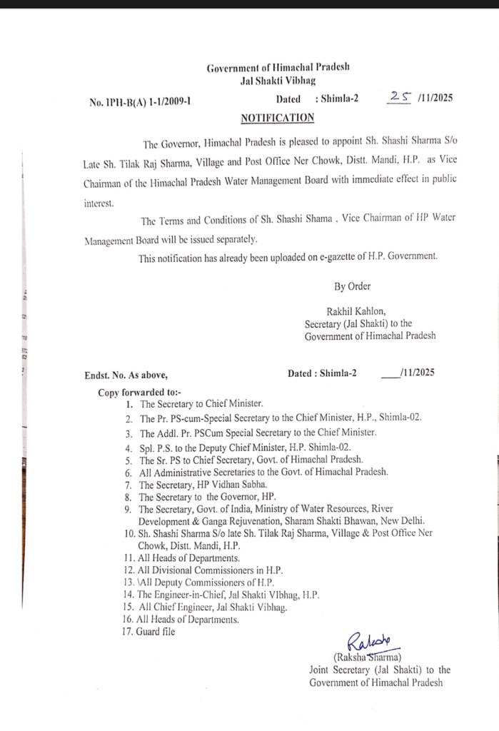 The Government of Himachal Pradesh has appointed Shashi Sharma, son of Late Sh. Tilak Raj Sharma of Village & Post Office Ner Chowk, Distt. Mandi, as the Vice Chairman of the Himachal Pradesh Water Management Board, effective immediately. The notification, issued by the Jal Shakti Vibhag on November 25, 2025, states that the terms and conditions of the appointment will be issued separately. The order has been uploaded in the e-gazette of the H.P. Government.